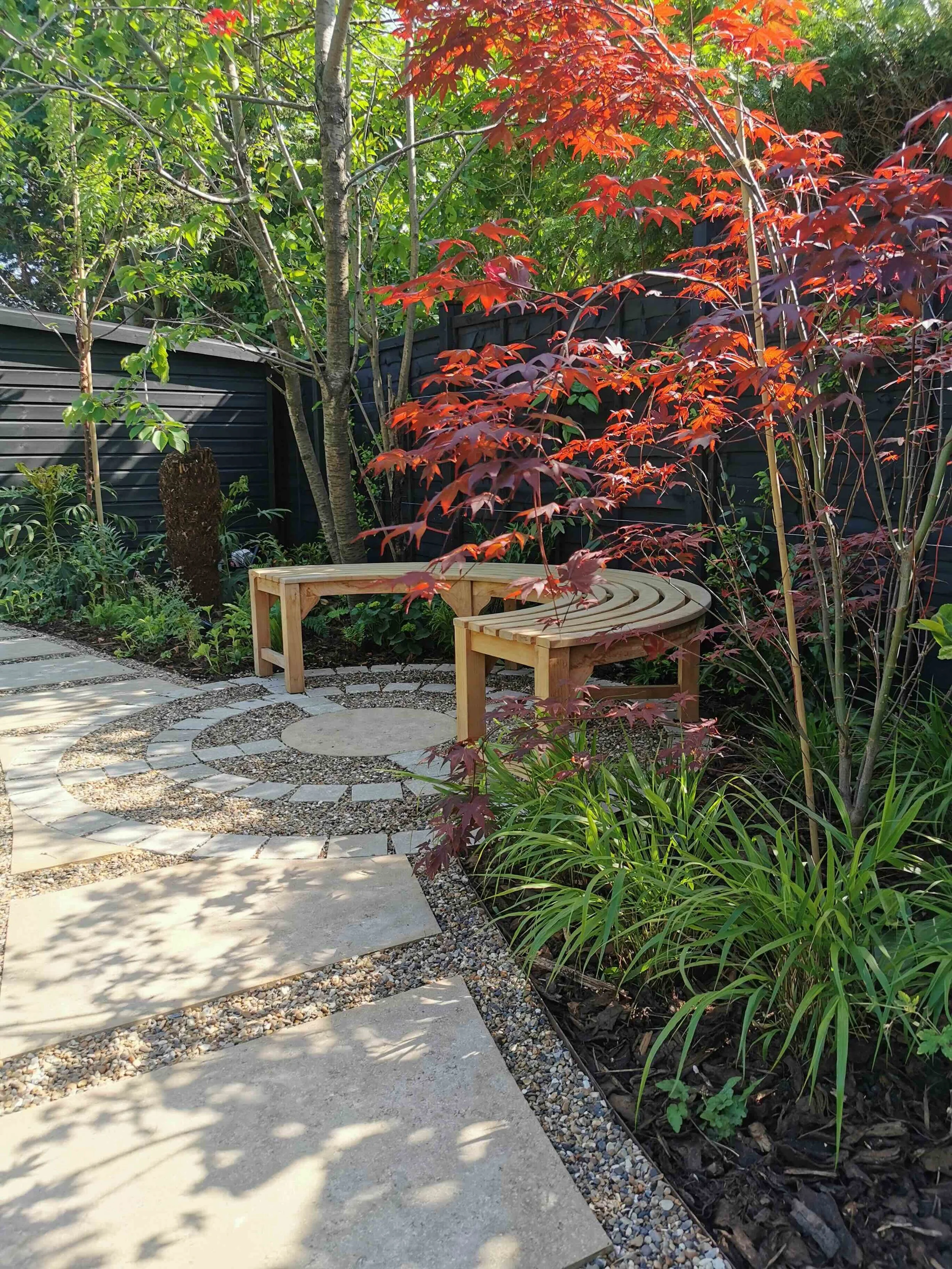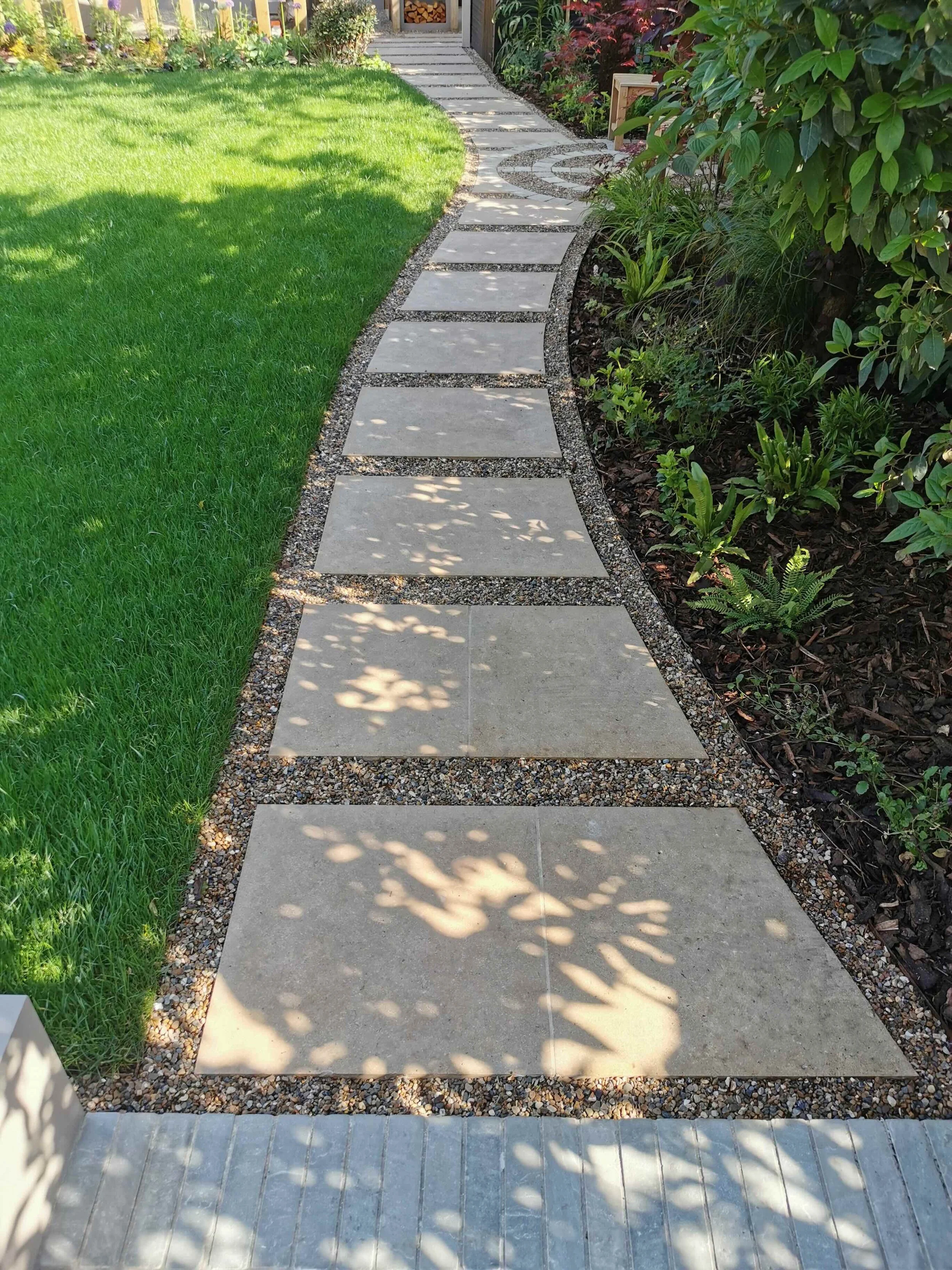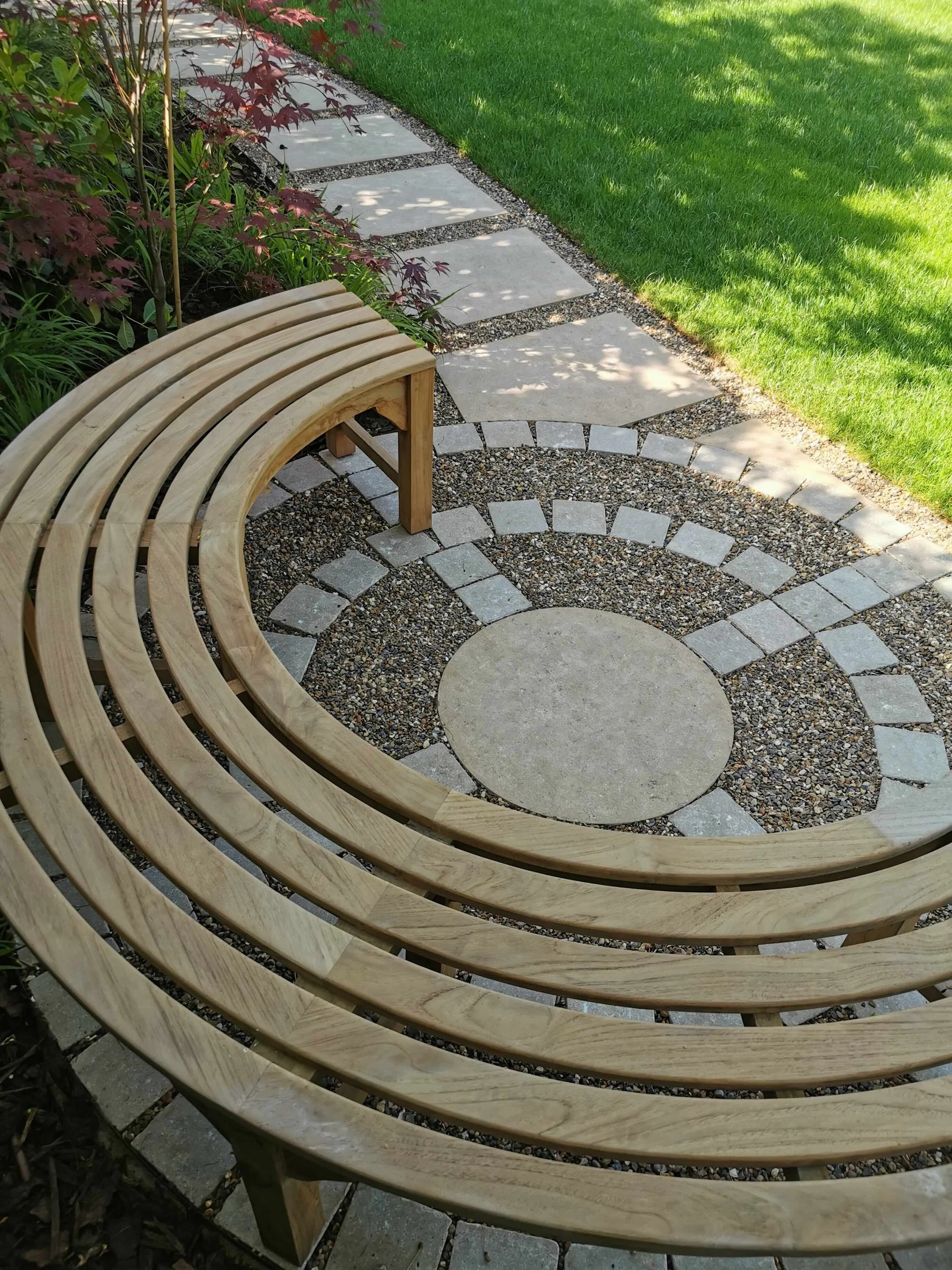 A curved path leading to the entertaining area. Punctuated by a shaded seating nook mid-way down to break up the monotony of the journey. Limestone setts cut from the same quarry as the path delineate the circular seating.