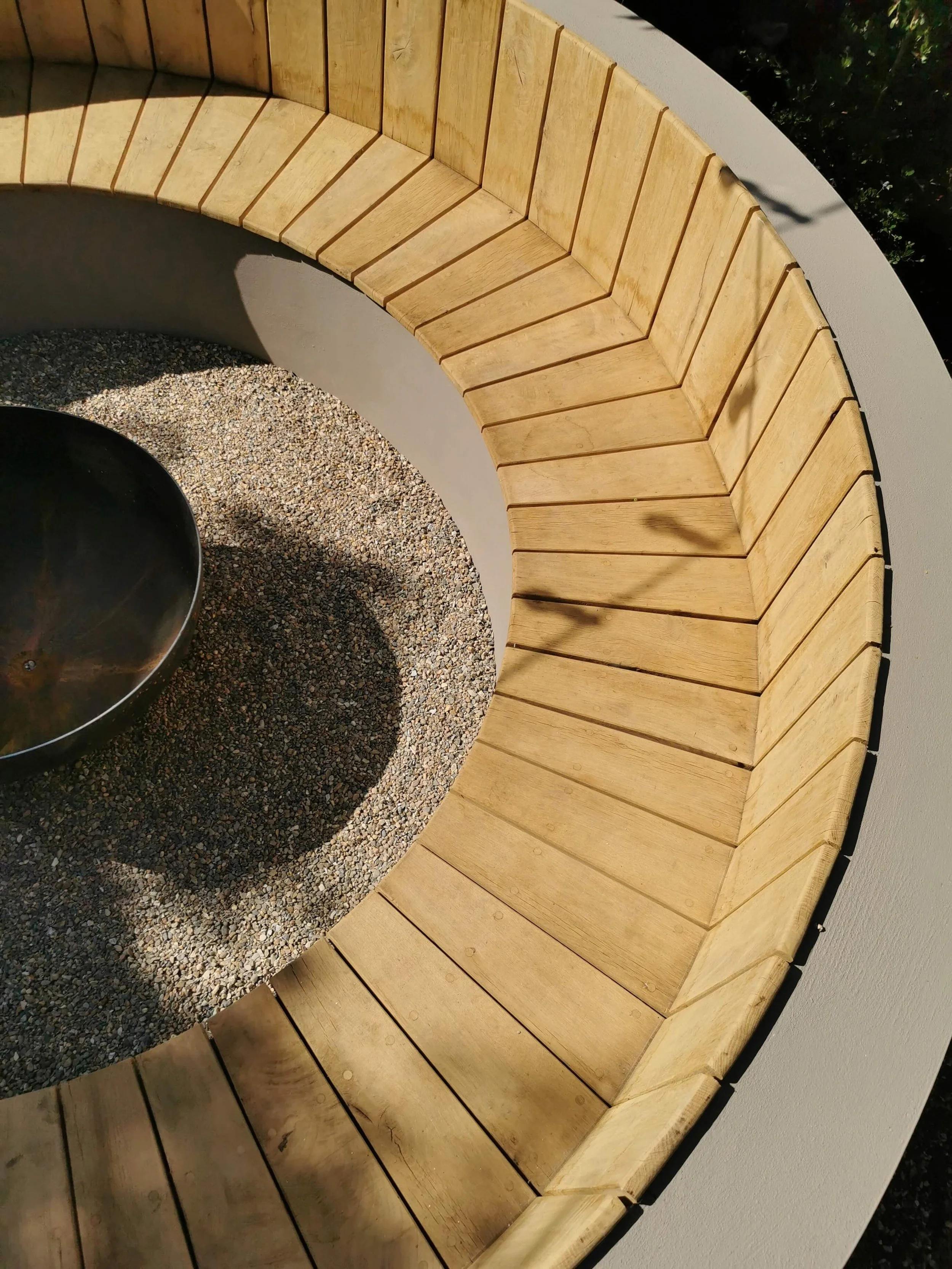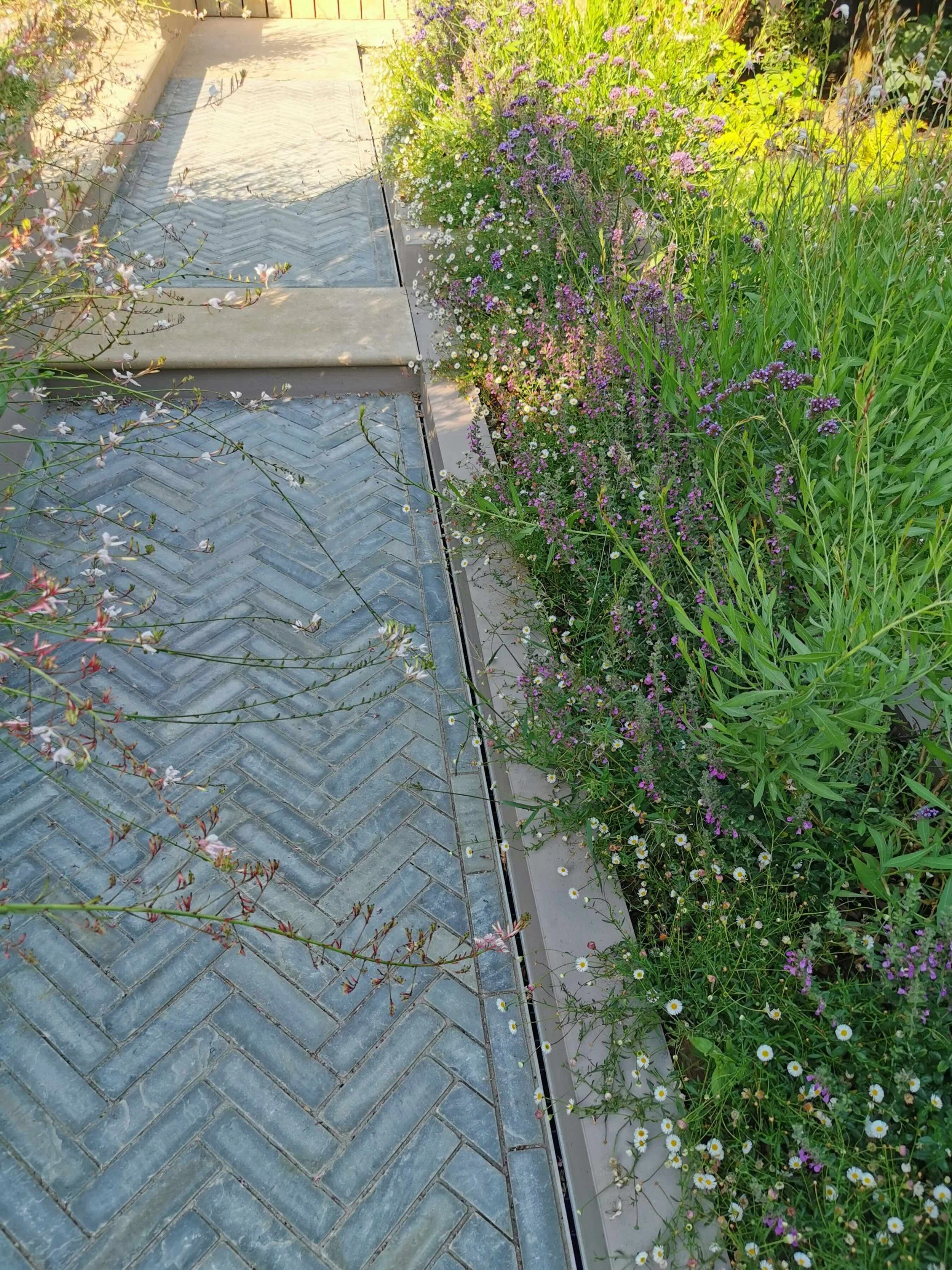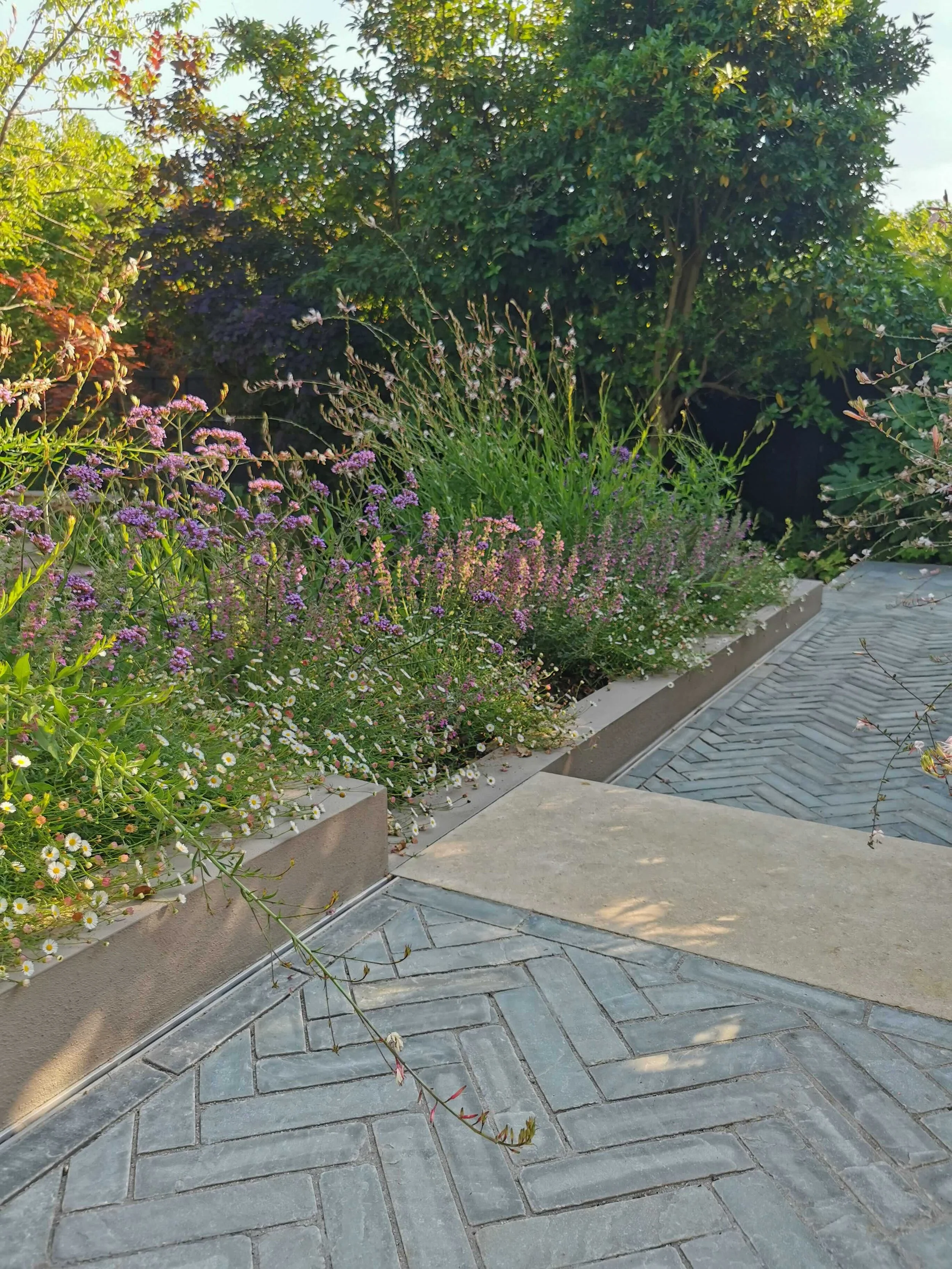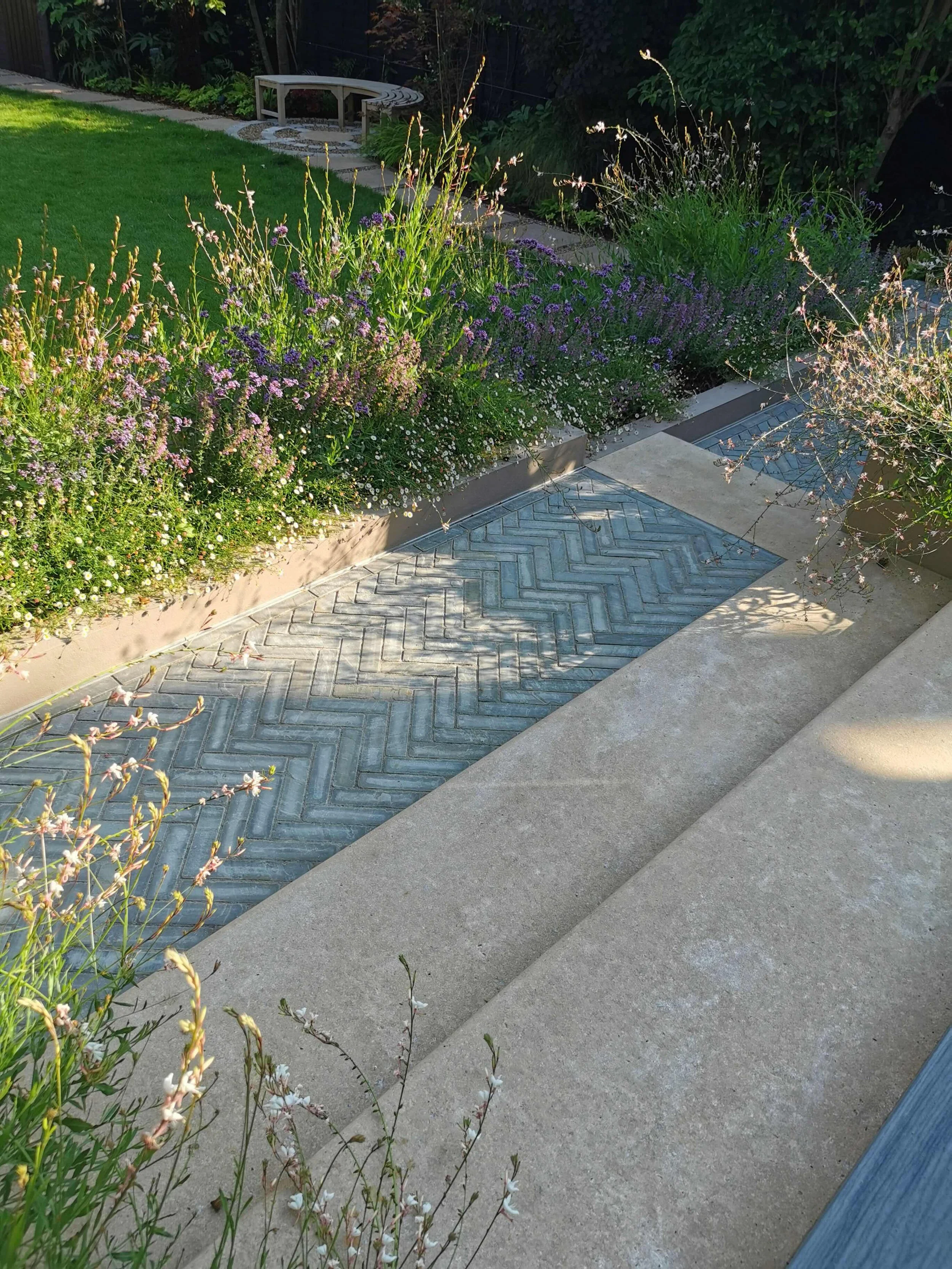 A curved path leading to the entertaining area. Punctuated by a shaded seating nook mid-way down to break up the monotony of the journey. Limestone setts cut from the same quarry as the path delineate the circular seating.