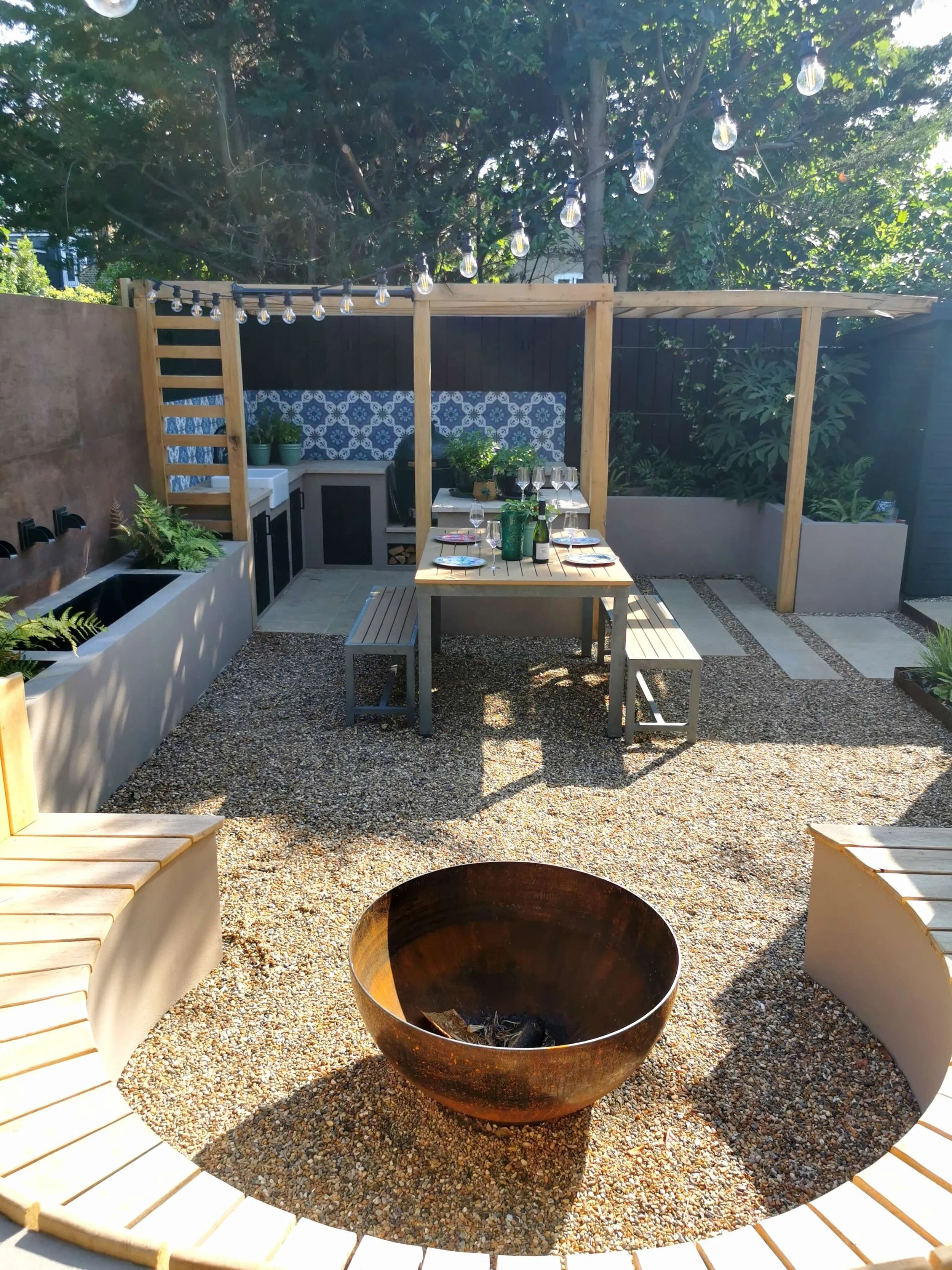 A raised deck leads down wide elegant steps framed on two sides with an abundance of planting. A curved path leads to a shaded seating nook set back from the path to punctuate the journey to the rear garden entertainment space. The sound of water gently bubbling next to the hammock zone. Beyond, the curved fire pit seating, dining and kitchen zone topped with twinkling lights.