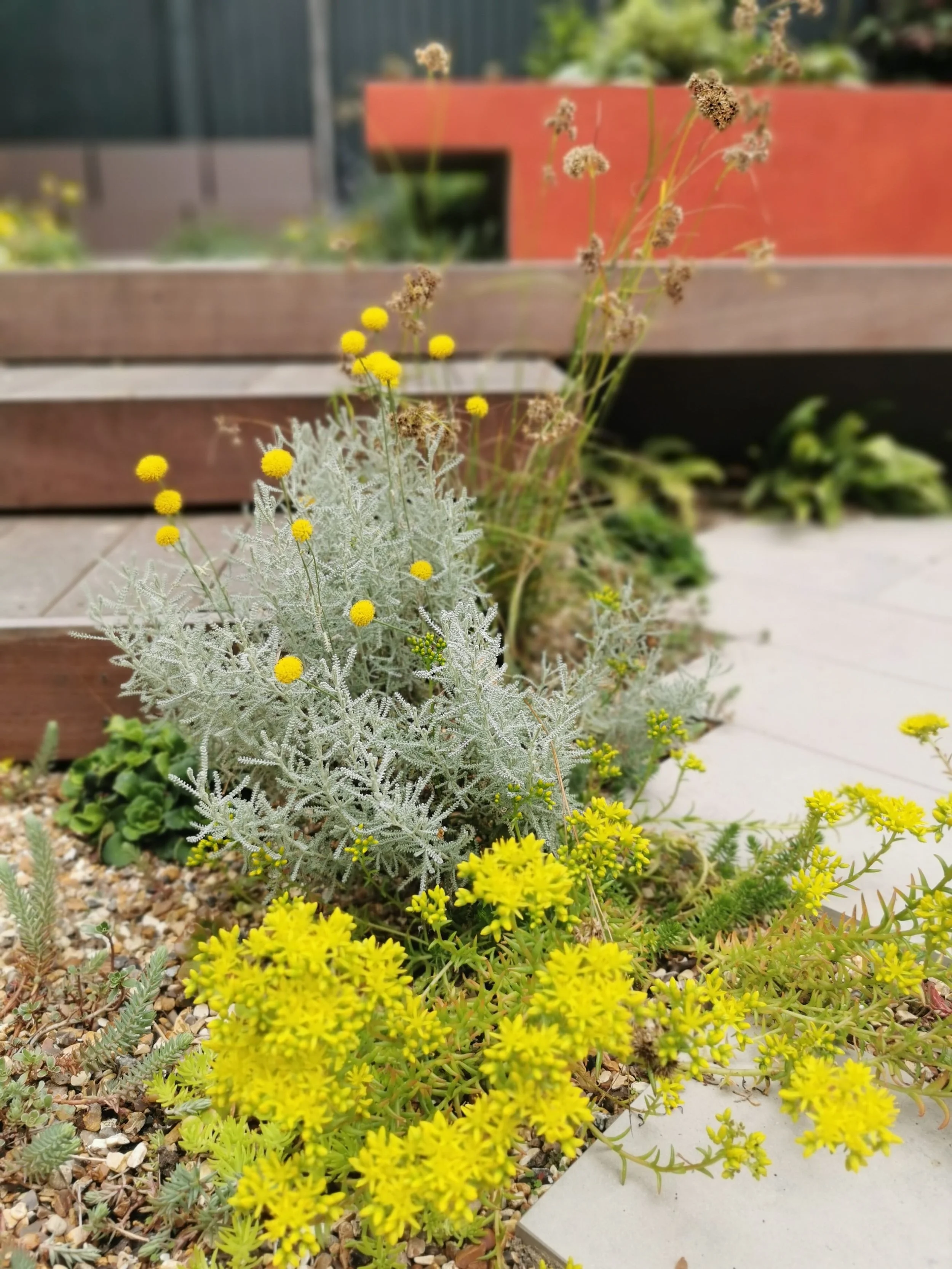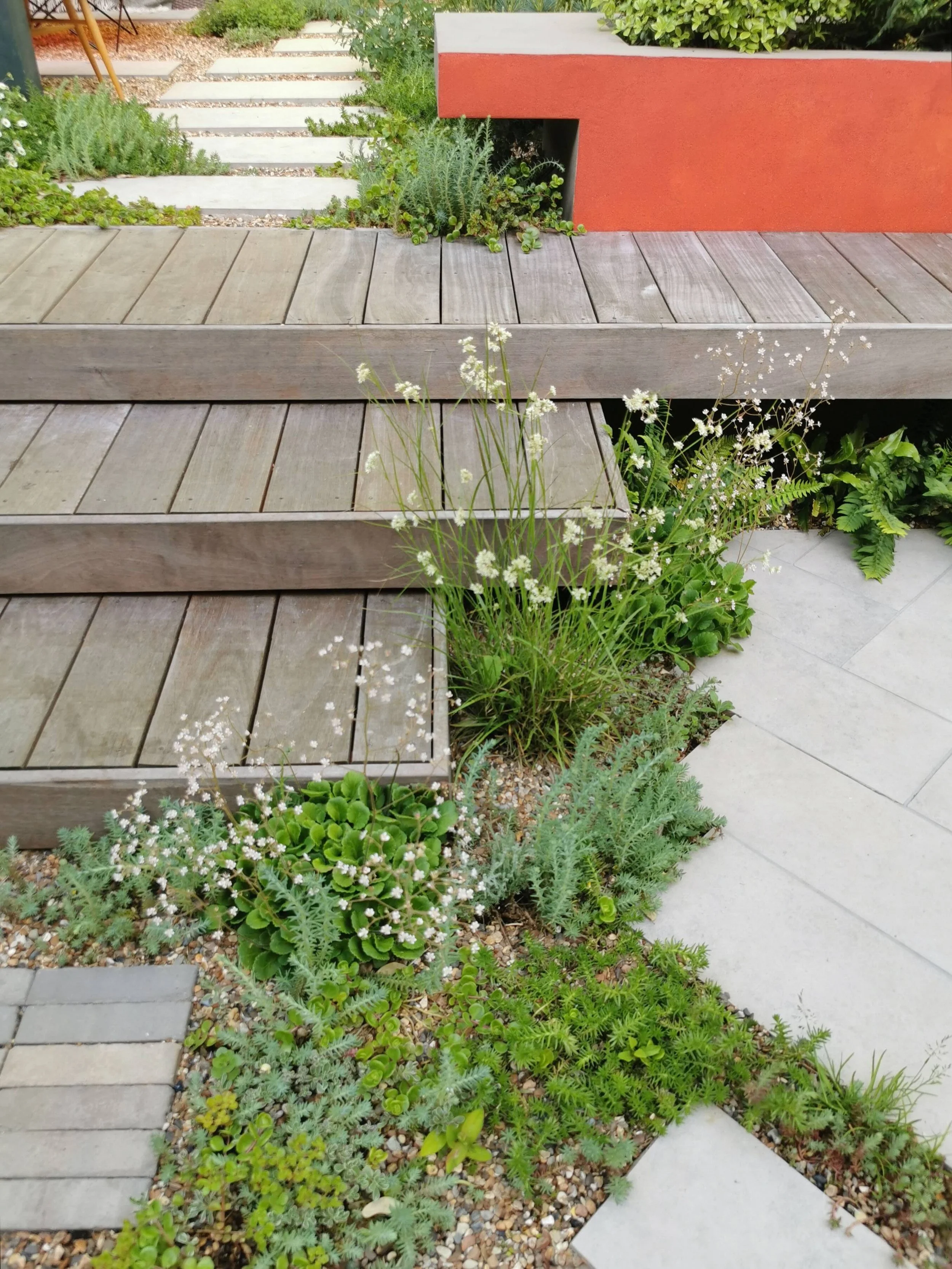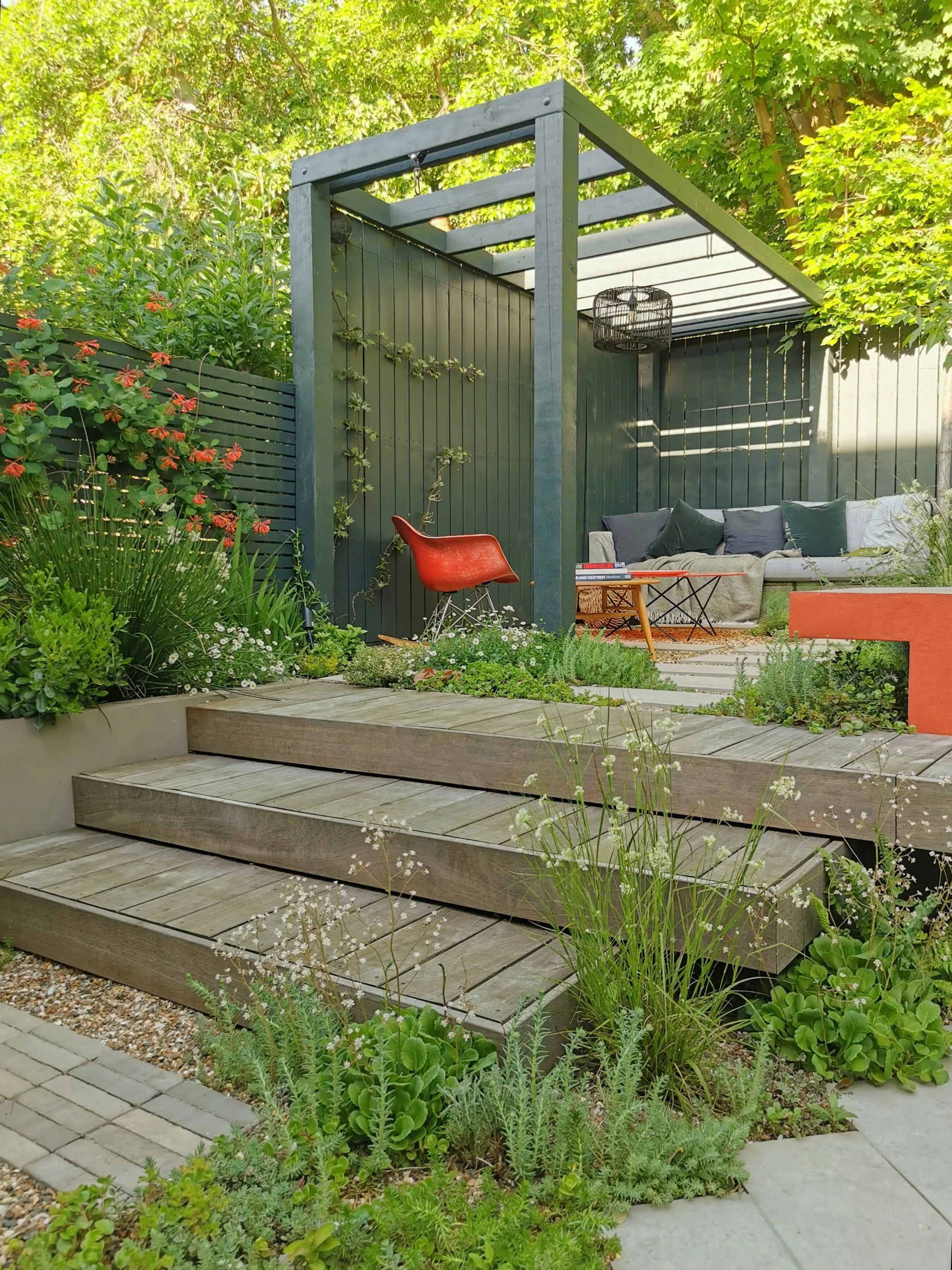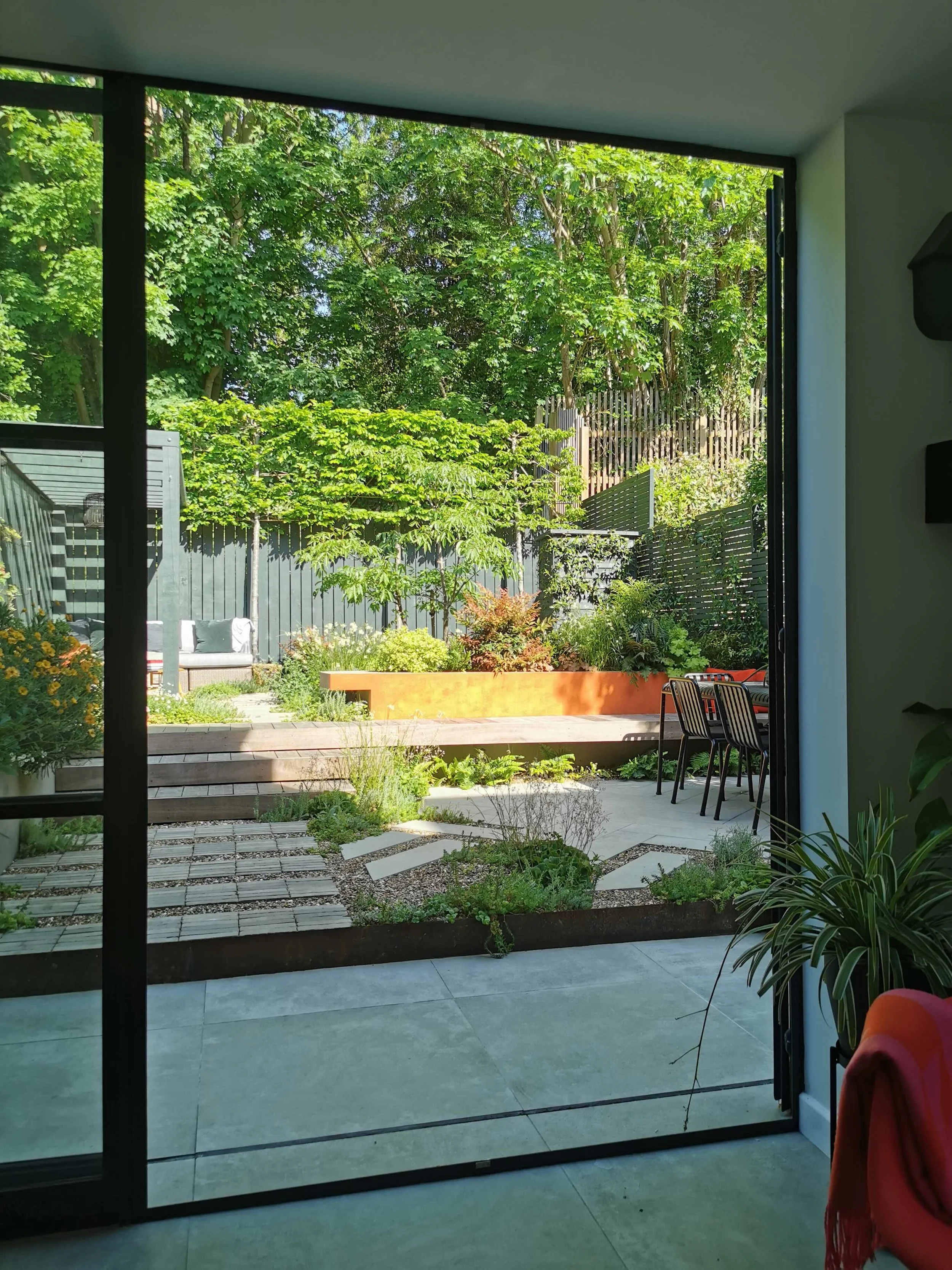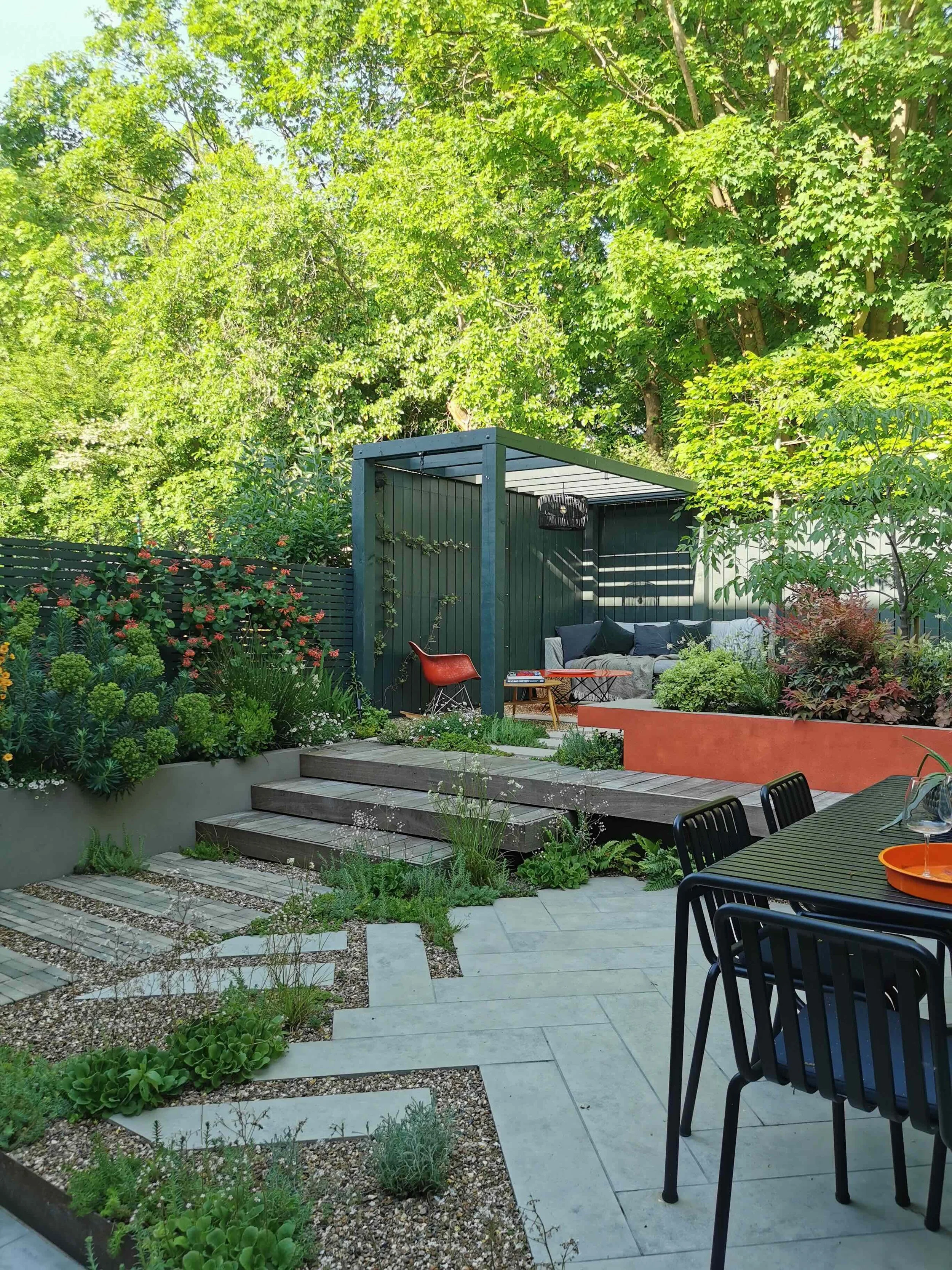 A garden on two levels with bold geometry at its heart. The burnt orange cantilevered planter cuts through the space creating a dynamic counterpoint to the surrounding planting which is set against the backdrop of the woodland walk nature trail.