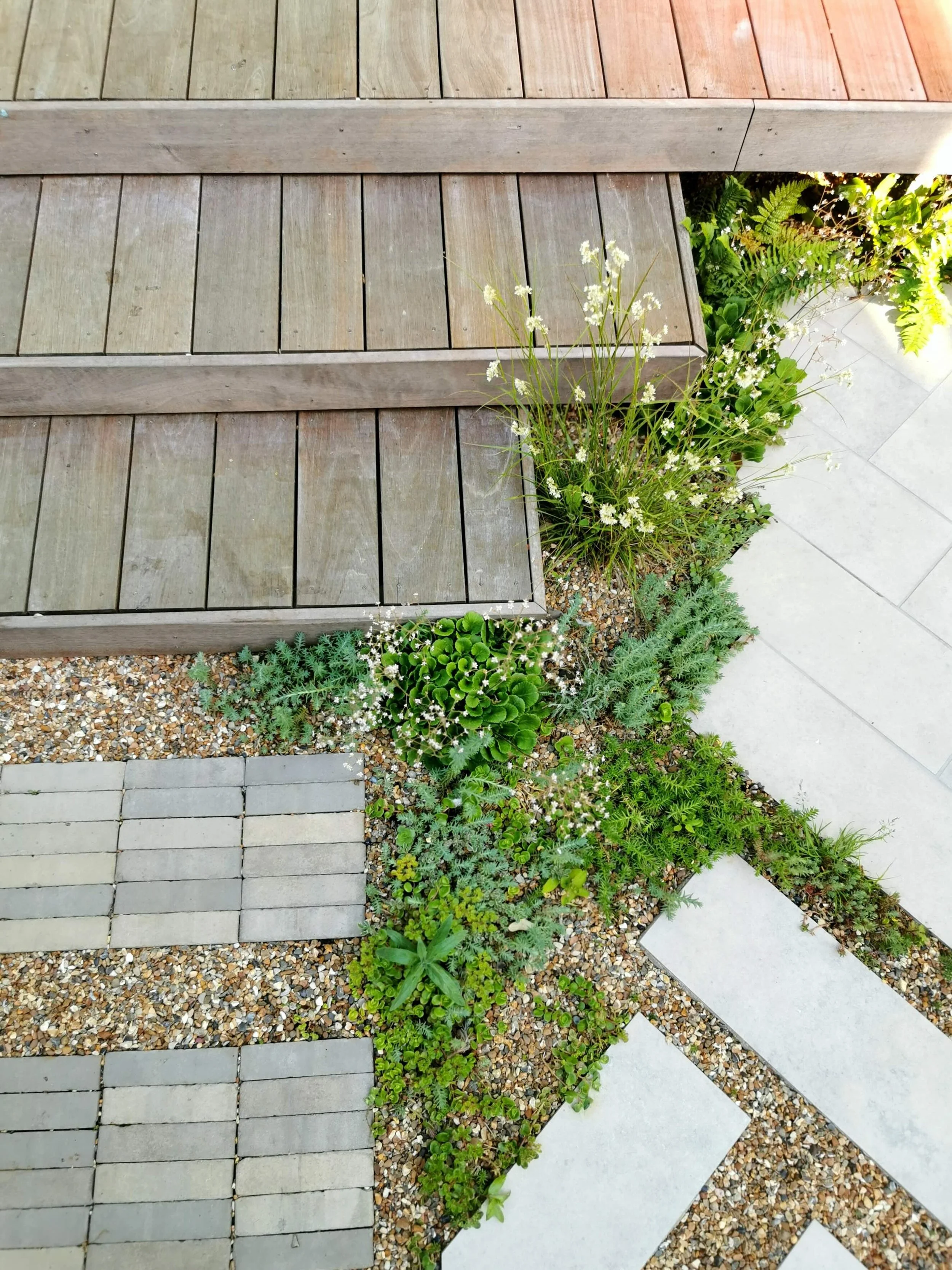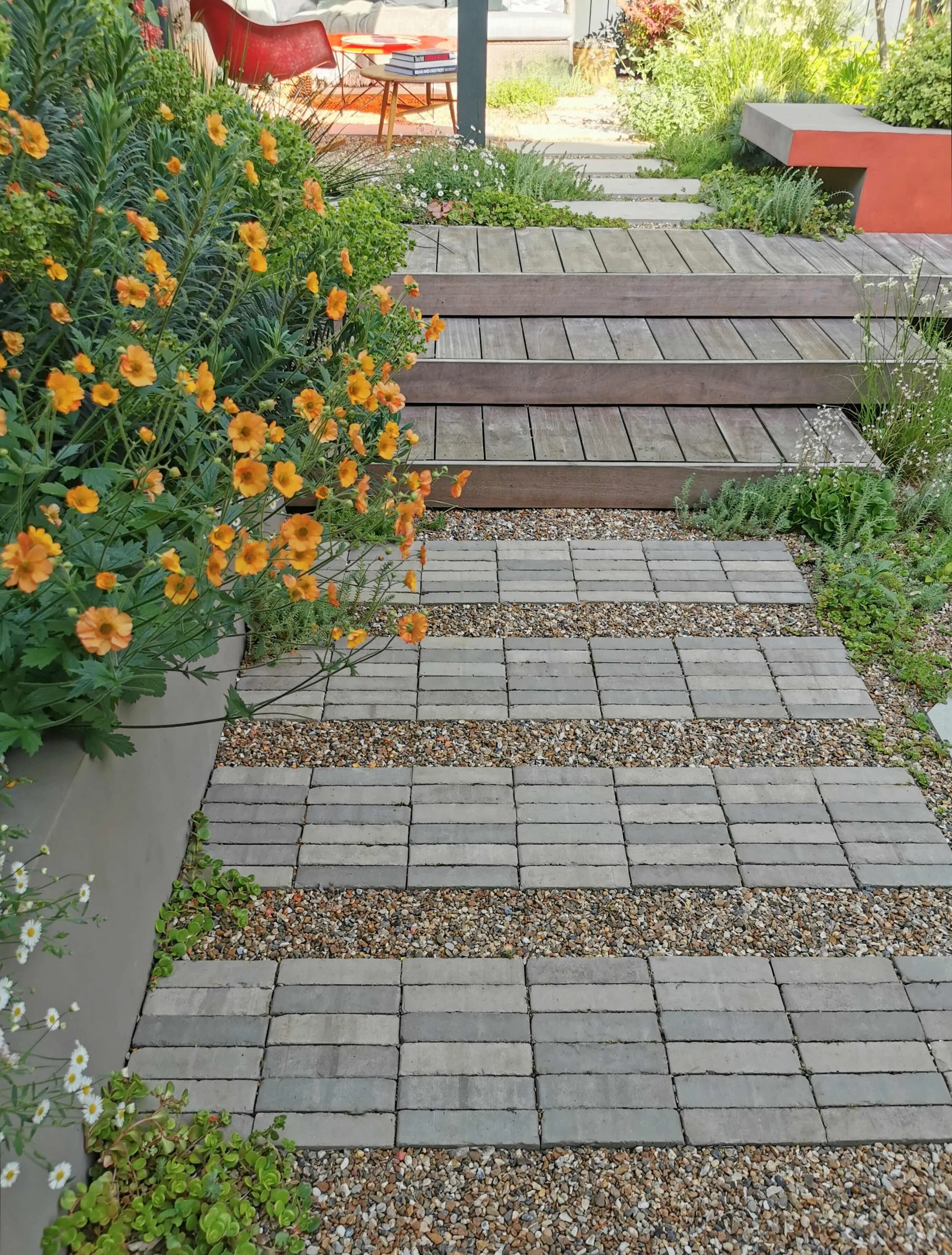 The clay pavers are laid in a stack bond formation opposing the direction of the wooden steps to create a counterpoint