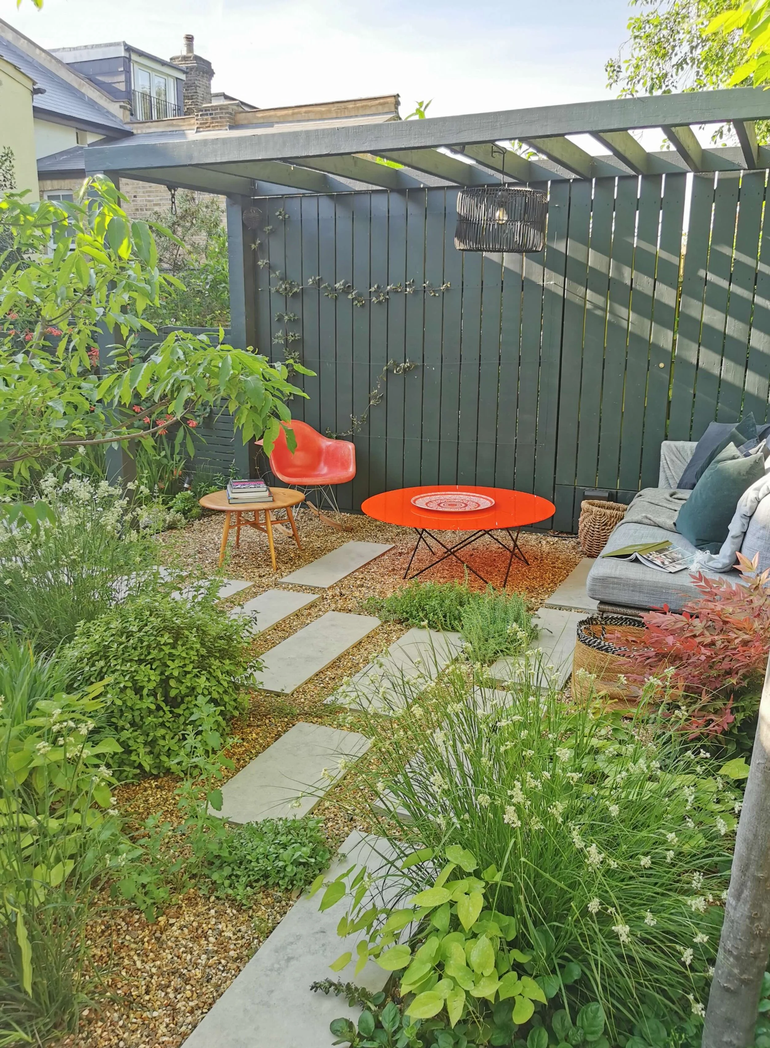 The pergola structure adds privacy, shade and incorporates lighting and a fixing point for the option of a swing chair.